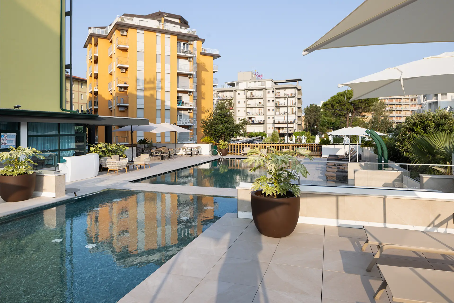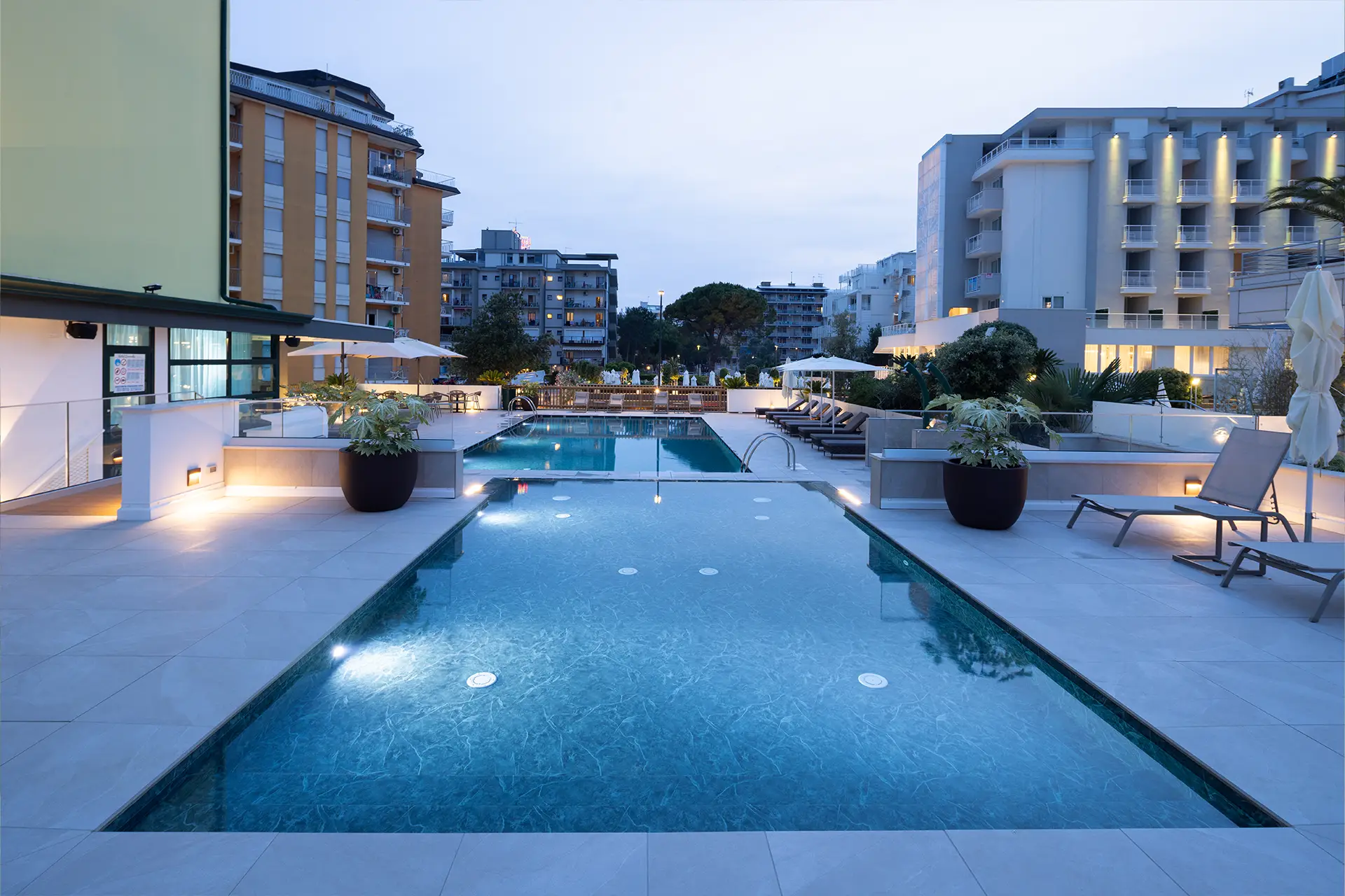 Potrete rilassarvi e godervi il mare durante il giorno, divertirvi in acqua con i vostri piccoli e tuffarvi nelle nostre nuovissime piscine riscaldate esterne, accanto all’hotel e alla terrazza, dove potrete godervi un ottimo cocktail o un pranzo a bordo piscina.