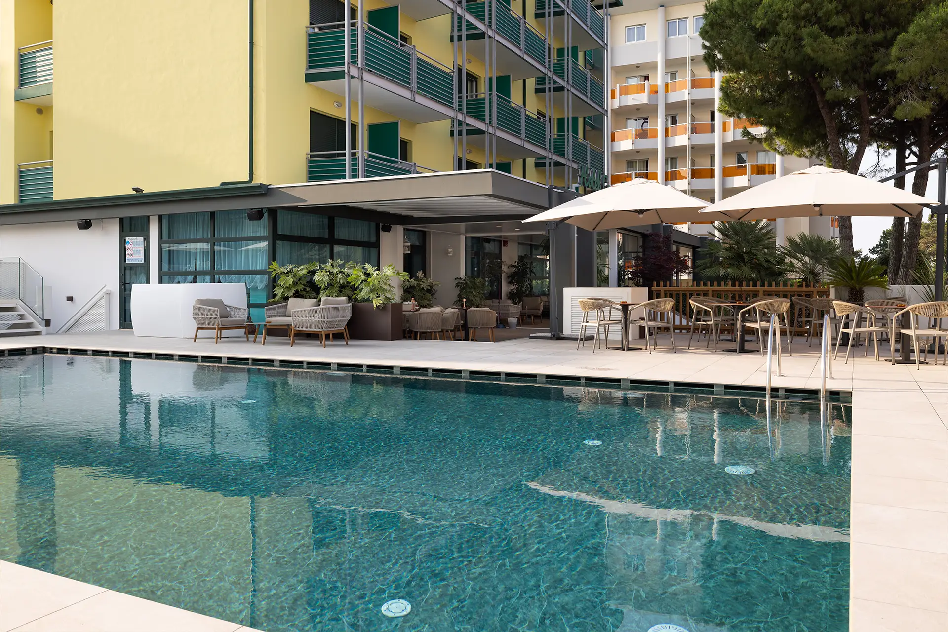 Soggiornando all'Hotel Concordia di Bibione, potrete consumare il vostro pranzo nella nuovissima terrazza e in piscina.
