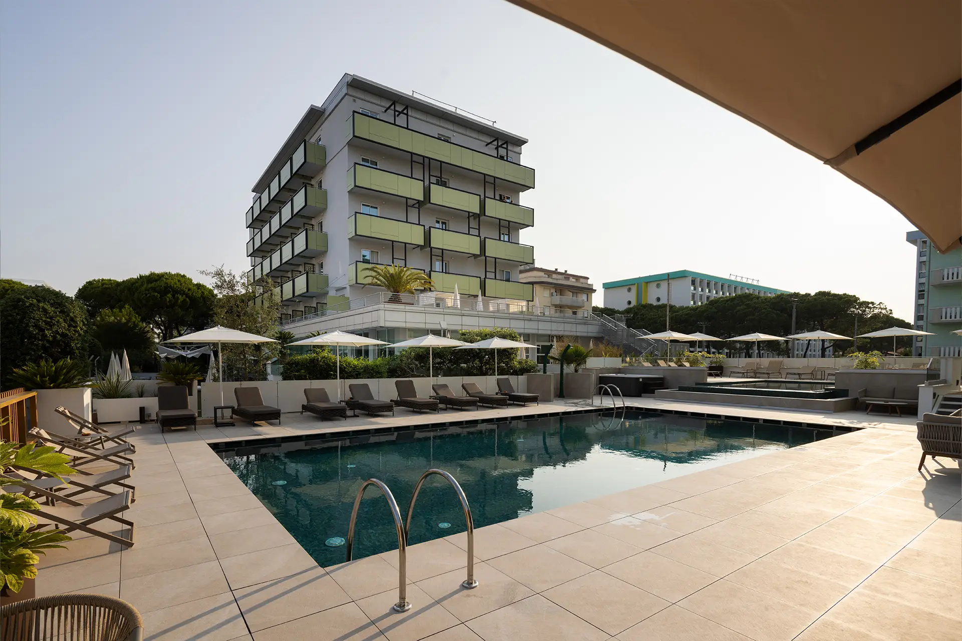 Zona solarium: con lettini comodi, ombrelloni e un’area relax immersa nel verde: il posto perfetto per staccare e godersi il sole.